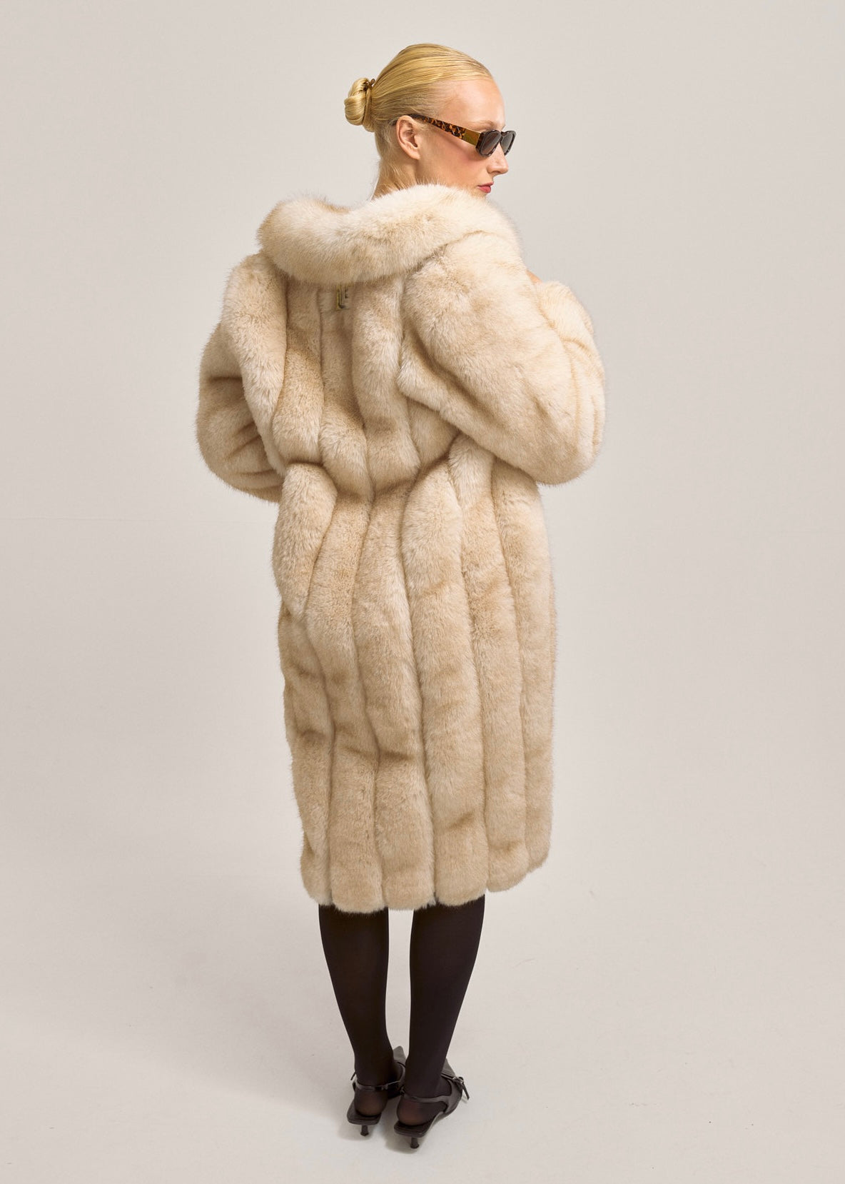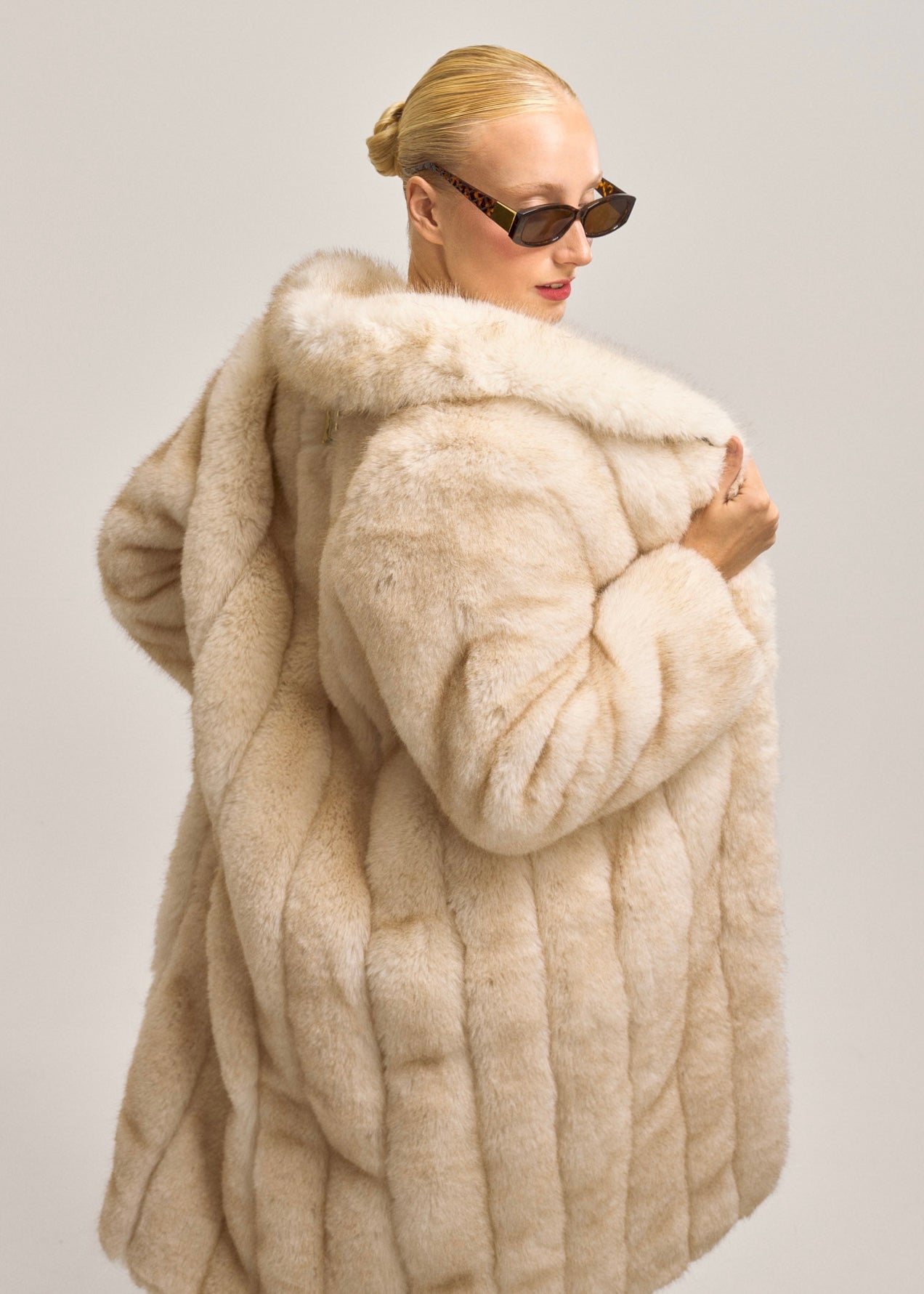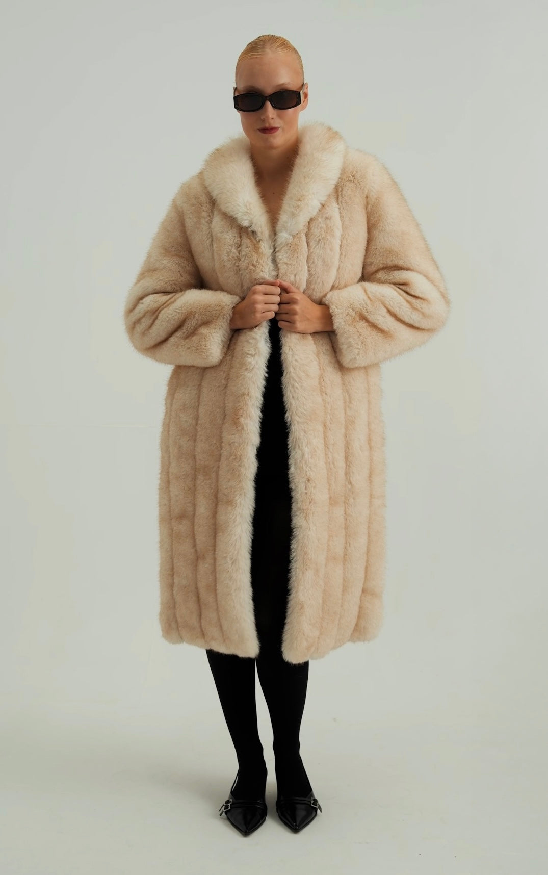 Inspired by the luminous tones of the Arctic fox, the Zyra Coat captures a spectrum of soft beige and ivory shades that shift gently with movement. Its refined structure and plush texture work seamlessly together, creating a silhouette that feels both sculptural and soft. Zyra holds its shape while draping fluidly — balanced in proportion, effortless in wear.