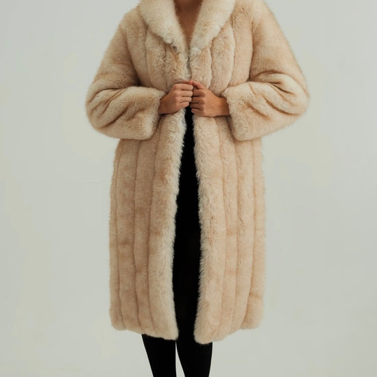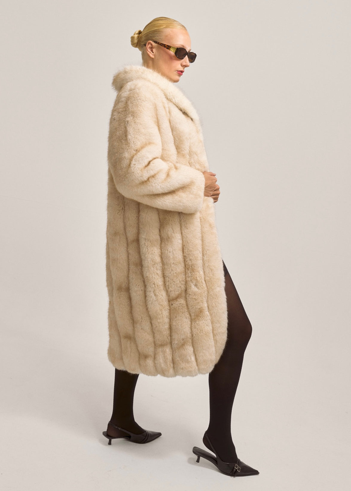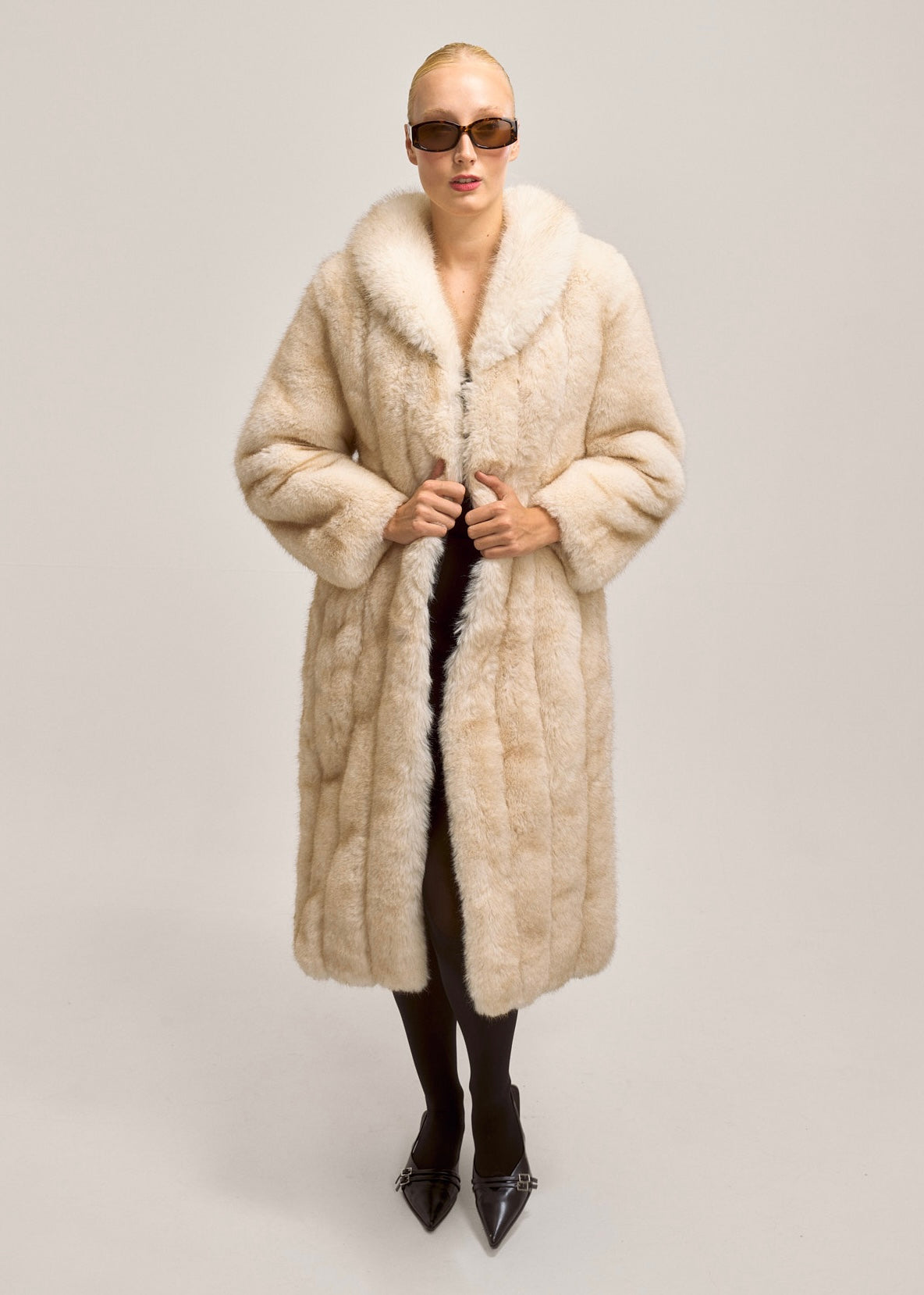 Inspired by the luminous tones of the Arctic fox, the Zyra Coat captures a spectrum of soft beige and ivory shades that shift gently with movement. Its refined structure and plush texture work seamlessly together, creating a silhouette that feels both sculptural and soft. Zyra holds its shape while draping fluidly — balanced in proportion, effortless in wear.